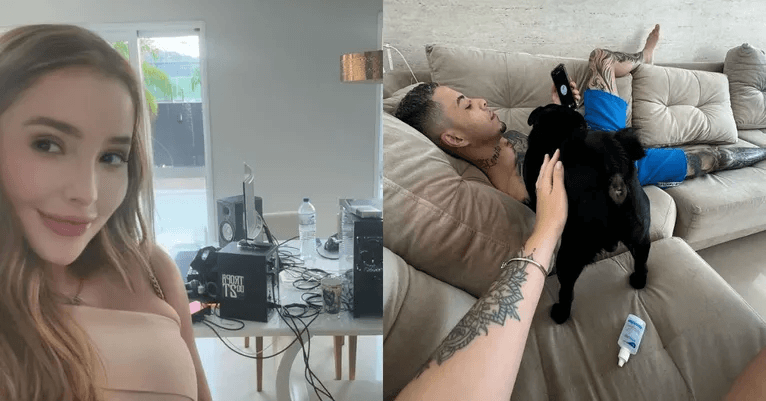 Nas imagens publicadas em seu perfil no Instagram, Any filma o funkeiro enquanto faz carinho em seu cachorro e mostra detalhes do que parece ser o apartamento do artista.