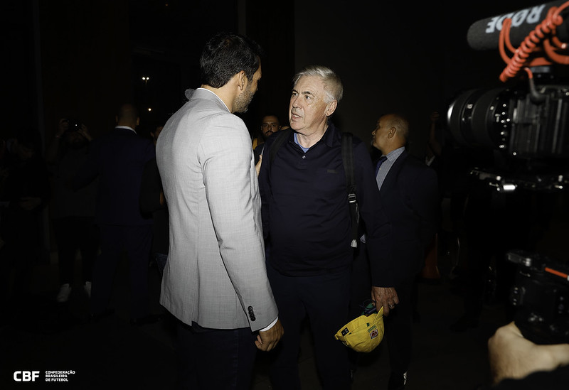 Ancelotti foi recebido pela nova diretoria da CBF, eleita no domingo, na sede da entidade. Samir Xaud e seus pares políticos estarão presentes no hotel para a entrevista.