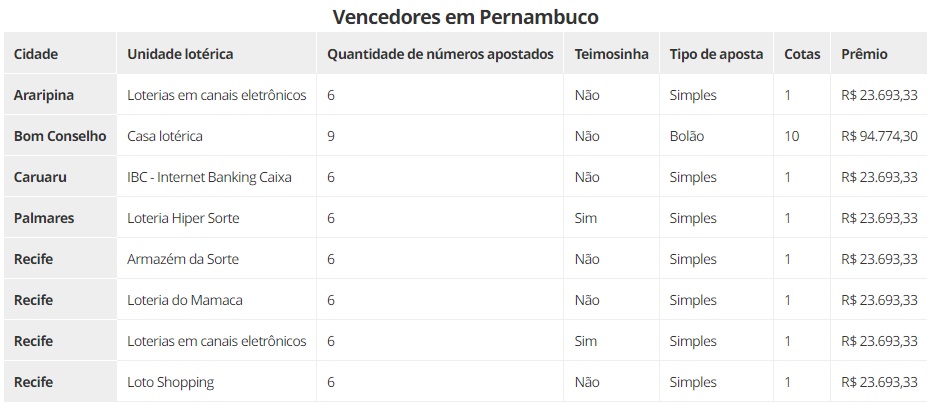 O sorteio foi realizado na noite do sábado (4), e nenhuma aposta acertou as seis dezenas. Além das cidades do interior de Pernambuco, outros quatro apostadores do Recife e um de Araripina também acertaram a quina.