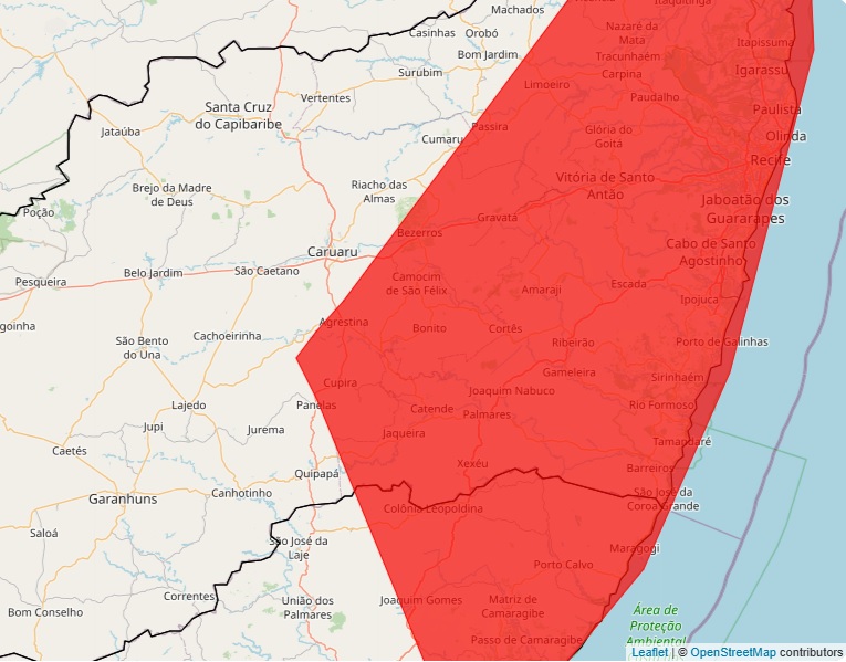 O Instituto Nacional de Meteorologia (Inmet) emitiu, às 5h18 desta quarta-feira (21), alerta vermelho de chuvas para a Região Metropolitana do Recife (RMR), Zonas da Mata Norte e Sul e Agrete de Pernambuco.