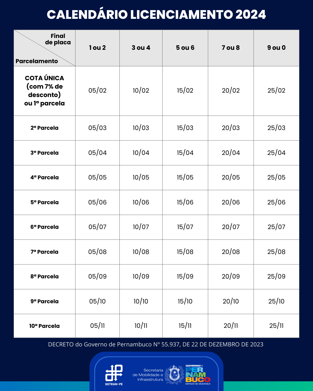 O calendário de pagamento do Licenciamento 2024, que inclui as taxas de IPVA, bombeiros e o próprio licenciamento, teve início no dia 05 de fevereiro, para os veículos com placas de final 1 ou 2, e segue, para as demais terminações, conforme tabela abaixo: