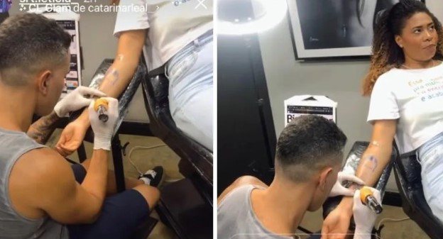 O responsável pelo trabalho foi o tatuador Rodrigo Catuaba. “A menina é fã do programa!”, disse ele.