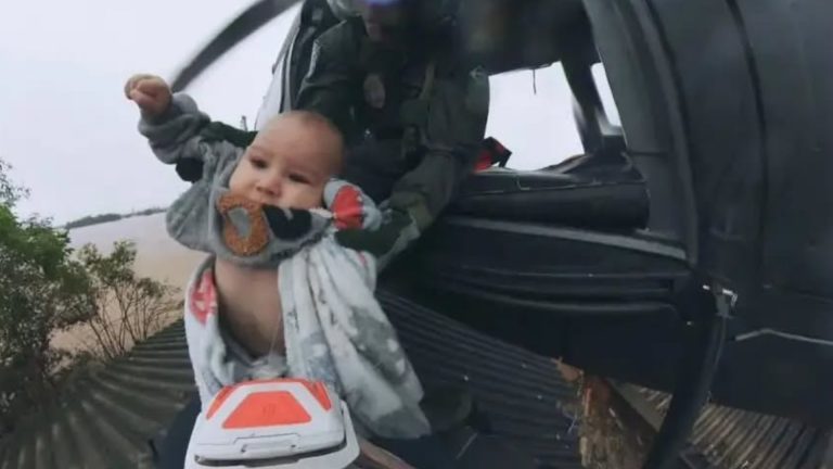 O Comando Militar do Sul resgatou Anthony pelo telhado de uma casa inundada no Vale do Taquari durante a tragédia climática.