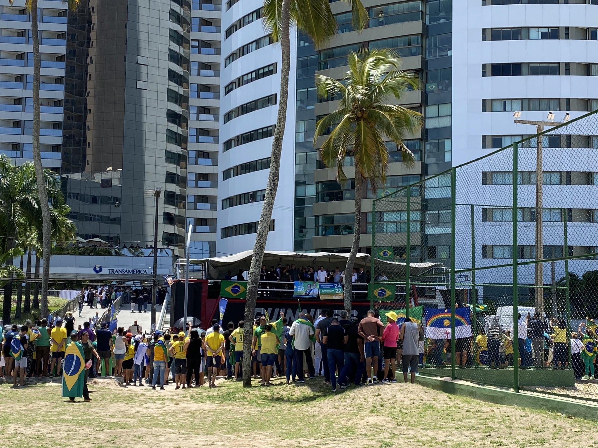 Além da plateia na avenida, apoiadores de Bolsonaro ficaram nas varandas de prédios ao redor do hotel no qual o presidente participou de um evento reservado com lideranças religiosas.