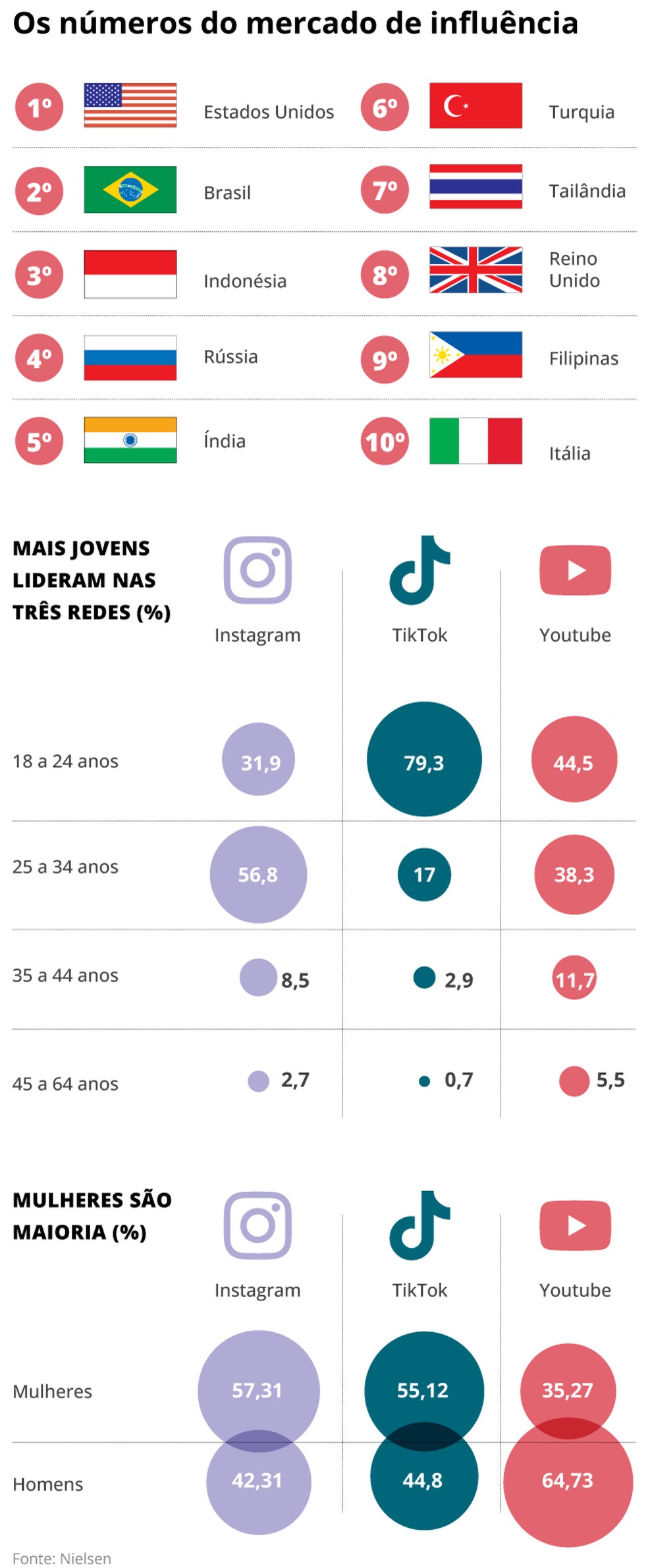 O Brasil é o segundo país com mais pessoas apostando na carreira, perdendo apenas para os Estados Unidos, onde 13,5 milhões trabalham como influenciadores, segundo pesquisa da consultoria Nielsen de 2022. Só no Instagram, o país lidera o ranking, com 10,5 milhões de influencers — o equivalente a oito vezes o número de advogados ou quase 20 vezes o número de médicos brasileiros, segundo dados da Ordem dos Advogados do Brasil (OAB) e do Conselho Federal de Medicina (CFM).