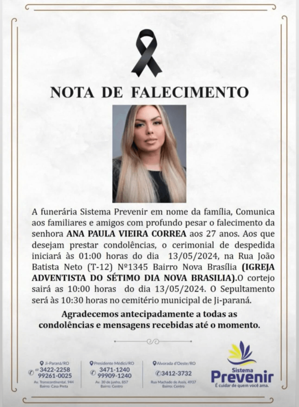 “Nota de pesar. A Prefeitura de Pimenta Bueno manifesta o seu mais profundo pesar pelo falecimento de Marcelo Augusto Stocco e Ana Paula Vieira Correa. Marcelo Stocco era vereador de Pimenta Bueno e durante seu mandato, se destacou por liderar diversas iniciativas em prol da população e do município, deixando uma marca significativa na comunidade de Pimenta Bueno”, lamentou a prefeitura de Pimenta Bueno.