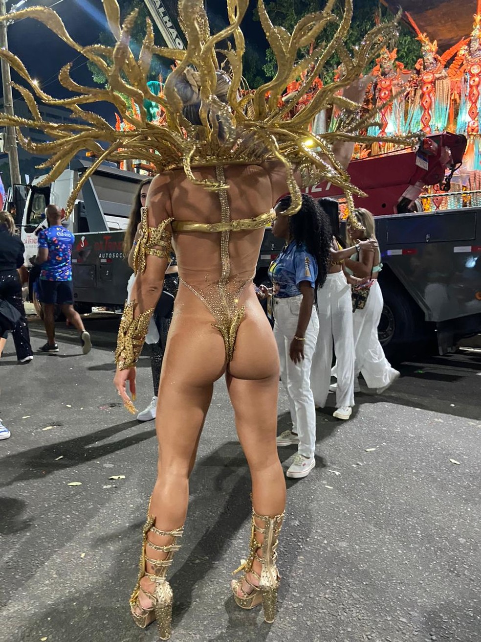Lore Improta desfilou como musa da Viradouro na manhã desta terça-feira (21) no Rio. A dançarina, que é casada com Léo Santana, contou na concentração que não estava usando tapa-sexo.