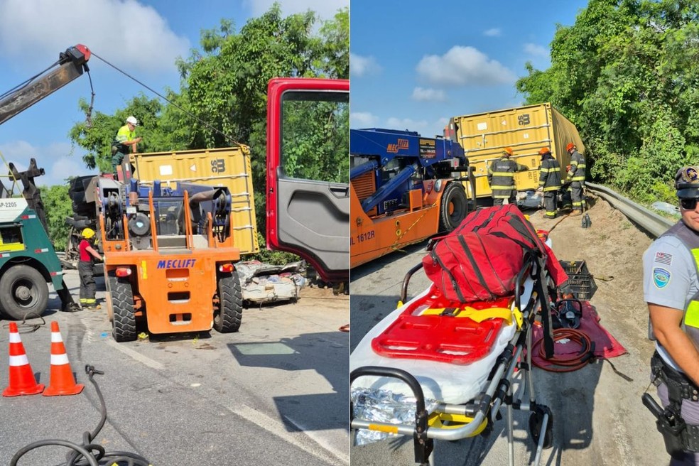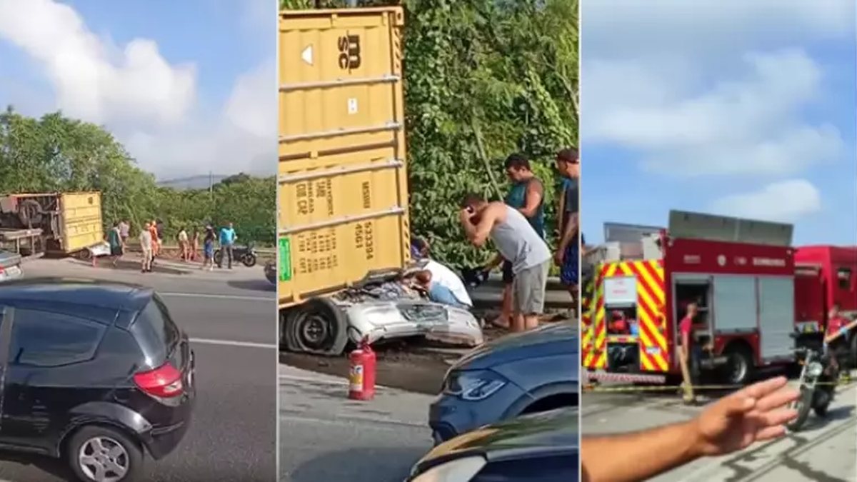 Uma carreta com contêiner tombou, atingiu um carro e matou três pessoas na rodovia Padre Manoel da Nóbrega. O acidente ocorreu, na manhã deste sábado (19), na altura de São Vicente, no litoral de São Paulo.