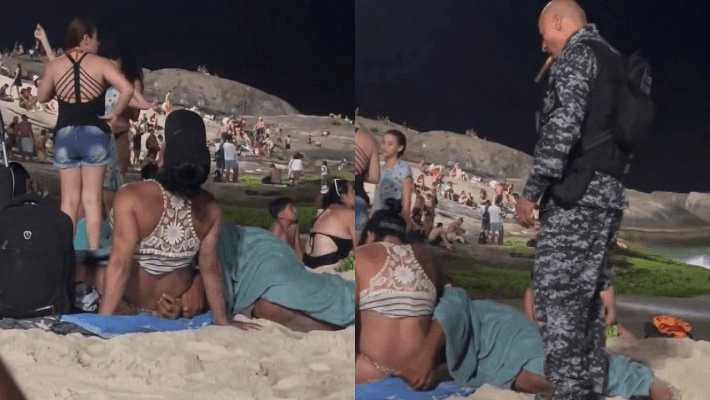 O momento íntimo de um casal, em plena praia movimentada por banhistas, foi interrompido por policiais militares na noite deste domingo (18). Em imagens que circulam nas redes sociais é possível ver a cena entre um homem e uma mulher na frente de dezenas de pessoas na praia do Arpoador, no Rio de Janeiro, local que acumula outros episódios de orgia.