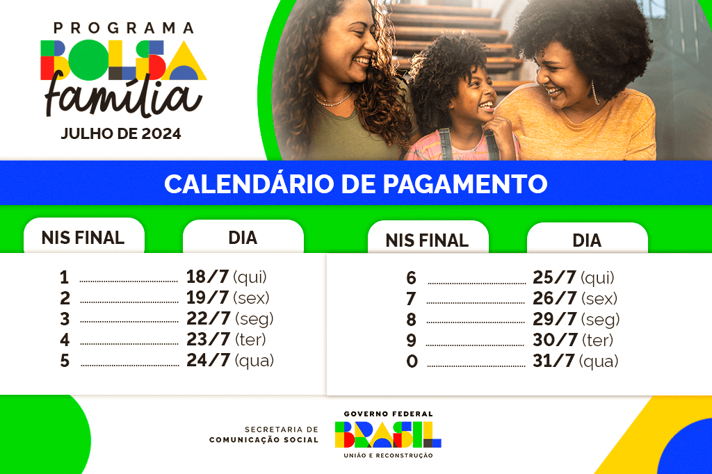 O cronograma de pagamento de julho do Bolsa Família tem início nesta quinta-feira, 18, em todo o país. São 20,8 milhões de famílias atendidas nos 5.570 municípios brasileiros, patamar que se mantém estável nos últimos quatro meses. O investimento do Governo Federal é de R$ 14,1 bilhões e o valor médio chega a R$ 682,56. Os repasses seguem de acordo com final do Número de Identificação Social (NIS) dos beneficiários até o dia 31 de julho