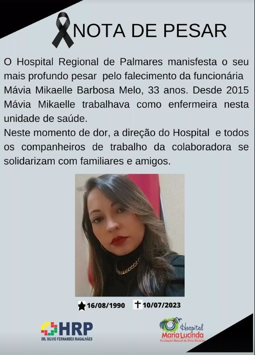 Mávia Mikaelly era enfermeira no Hospital Regional de Palmares desde de 2015. O hospital emitiu uma nota.