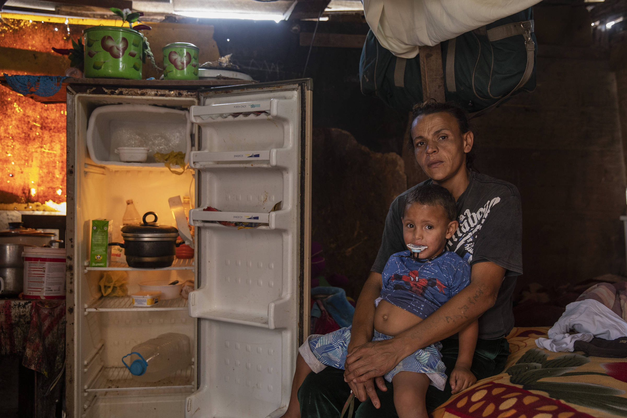 Família com geladeira quase vazia em barraco no Jardim Papai Noel, em Parelheiros, zona sul de São Paulo – Lalo de Almeida/ Folhapress