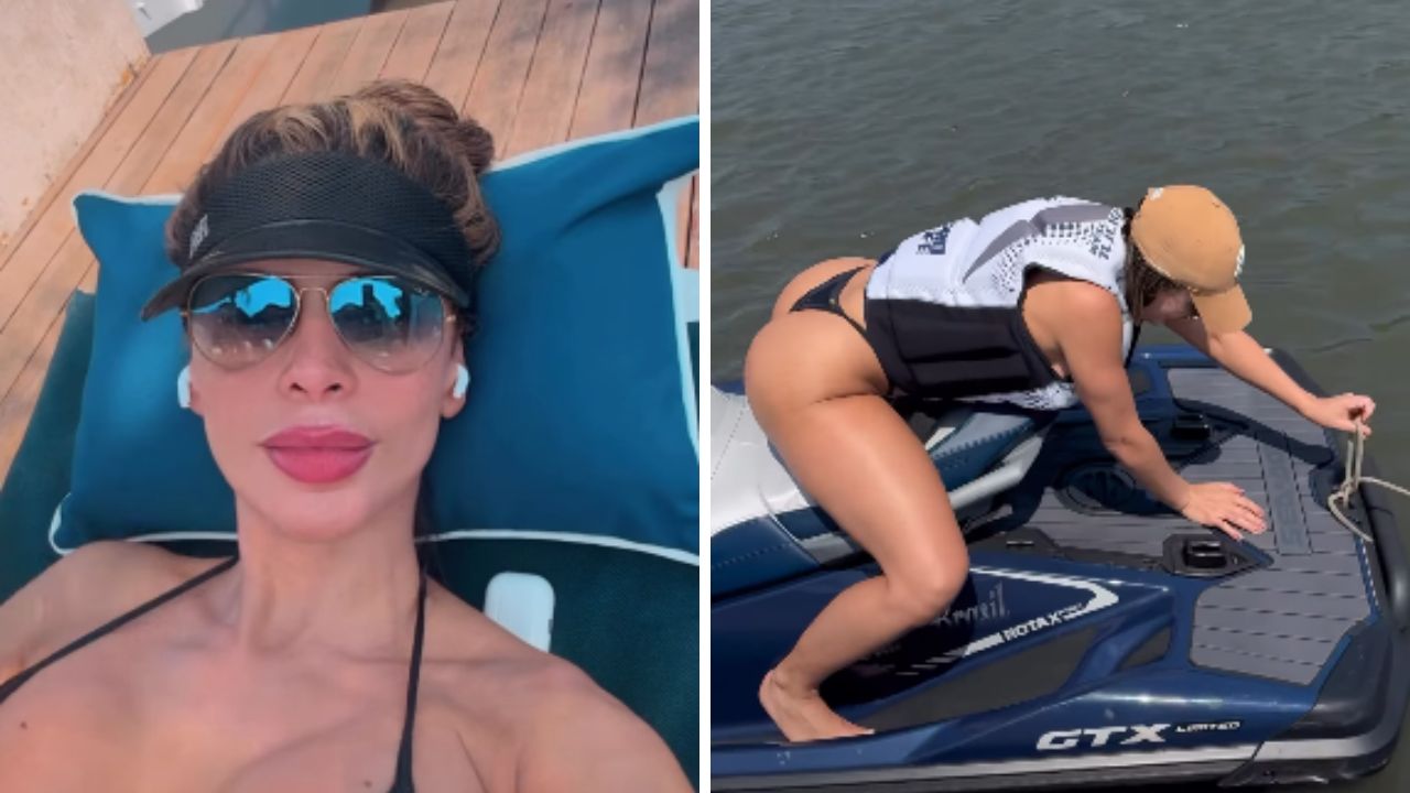 No registro publicado no Instagram, a atriz apareceu usando um fio-dental preto enquanto renovava a marquinha. Logo após, a influenciadora apareceu andando em uma moto aquática.
