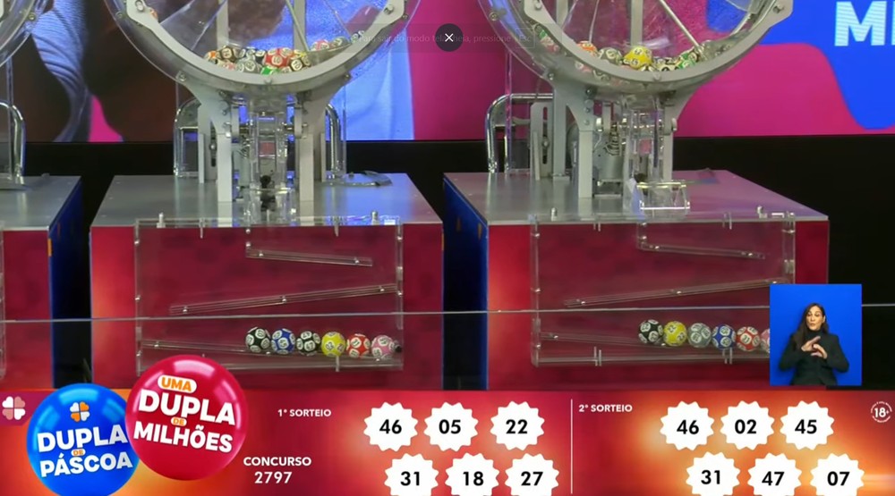 Os números sorteados na 1ª faixa da Dupla de Páscoa foram: 05 – 18 – 22 – 27 – 31 – 46