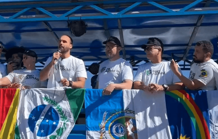 O deputado Eduardo Bolsonaro (PL-SP), filho do ex-presidente Jair Bolsonaro, participou de um ato pró-armas em Brasília neste domingo, 8, e comparou “professores doutrinadores” a traficantes de drogas.