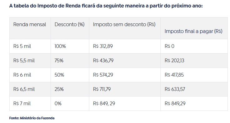 Para esse grupo de contribuintes, a proposta prevê um desconto de até R$ 312,89 do imposto a pagar para garantir que ao final o IR devido seja zero. O governo estima que 10 milhões de contribuintes que hoje são tributados ficarão isentos com a medida.