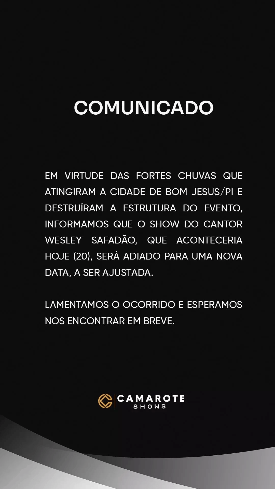 Em virtude das fortes chuvas que atingiram a cidade de Bom Jesus/PI e destruíram a estrutura do evento, informamos que o show do cantor Wesley Safadão, que aconteceria hoje (20), será adiado para uma nova data, a ser ajustada. Lamentamos o ocorrido e esperamos nos encontrar em breve.