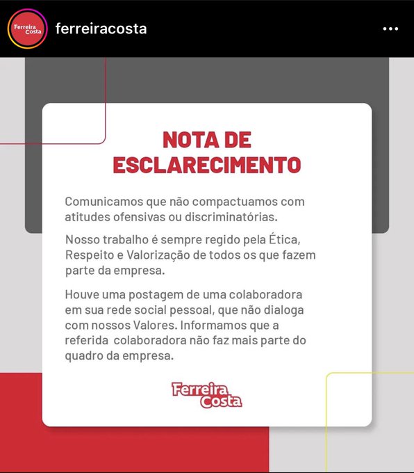 “Houve uma postagem de uma colaboradora em sua rede social pessoal, que não dialoga com nossos valores. Informamos que a referida colaboradora não faz mais parte do quadro da empresa”, afirma a Ferreira Costa.