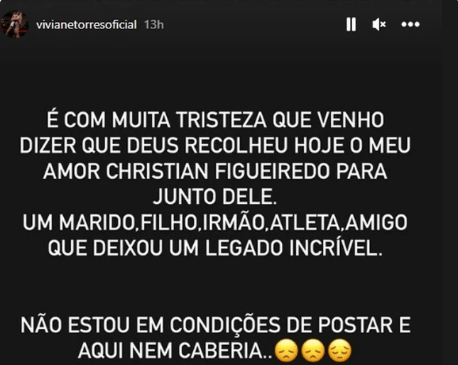– É com muita tristeza que venho dizer que Deus recolheu hoje o meu amor Christian Figueiredo para junto dele. Um marido, filho, irmão, atleta, amigo que deixou um legado incrível – escreveu na publicação, sem mencionar a causa da morte.