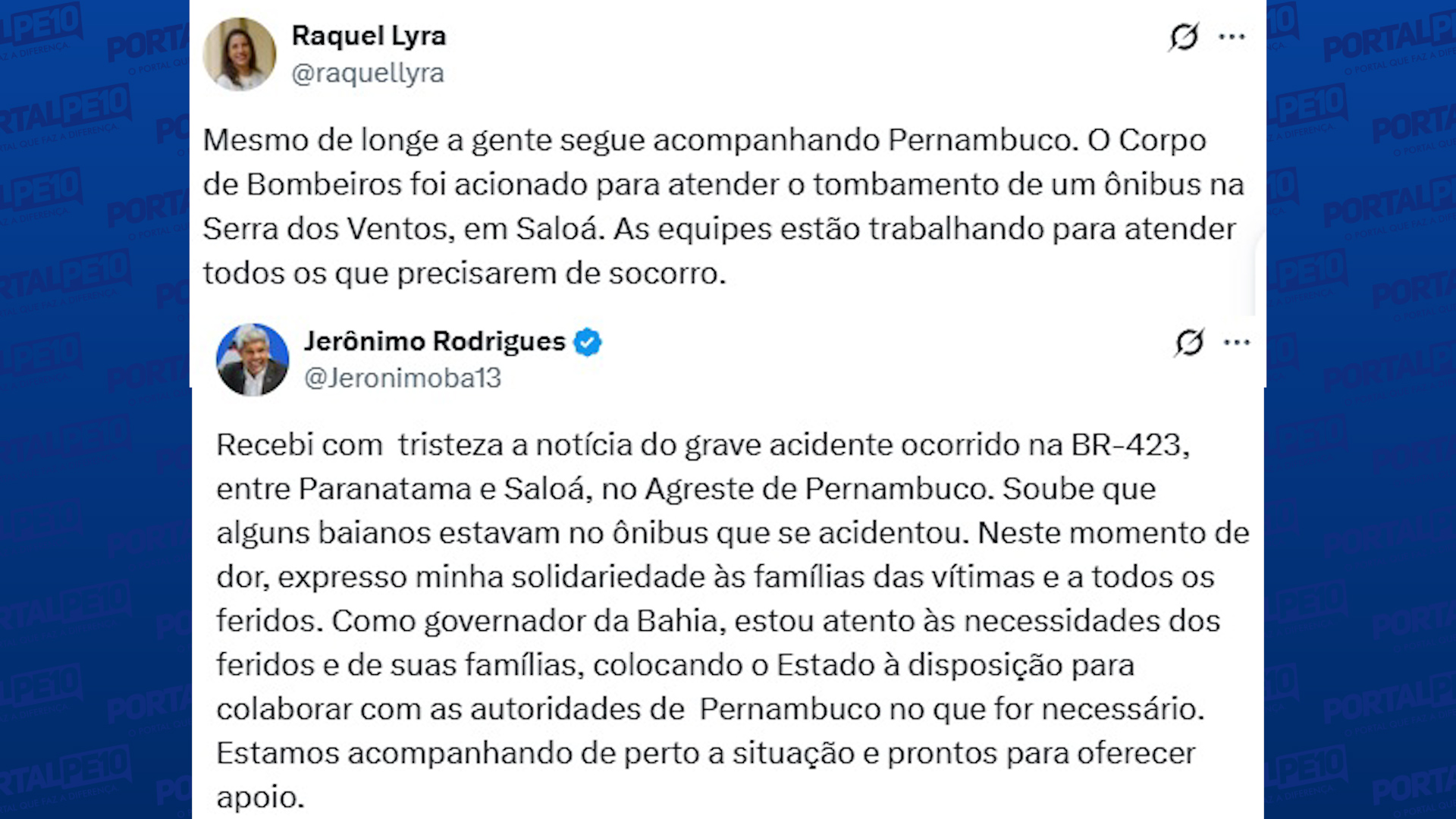 Já a governadora de Pernambuco, Raquel Lyra, que está em viagem oficial à China, informou que as equipes estão atuando para prestar todo apoio necessário aos feridos e às famílias enlutadas.