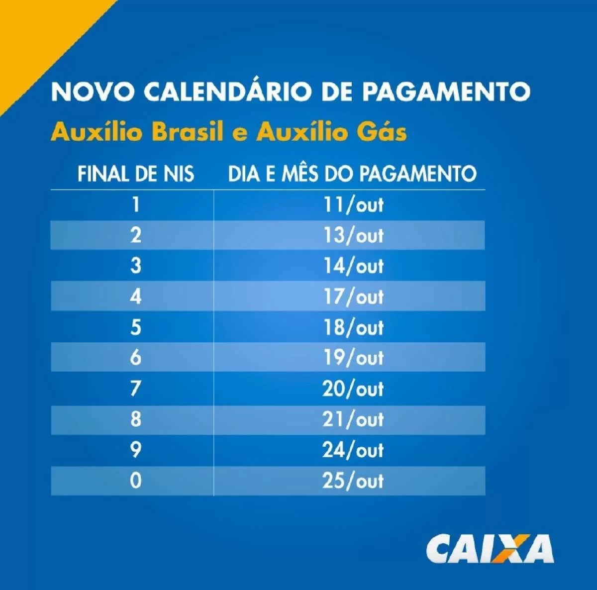 A Caixa antecipou, no mês de outubro, o calendário de pagamento do Auxílio Brasil e do Auxílio Gás para as famílias beneficiárias. O crédito, previsto inicialmente para ser realizado no dia 18, ocorrerá a partir de 11 para os beneficiários com final de NIS 1.