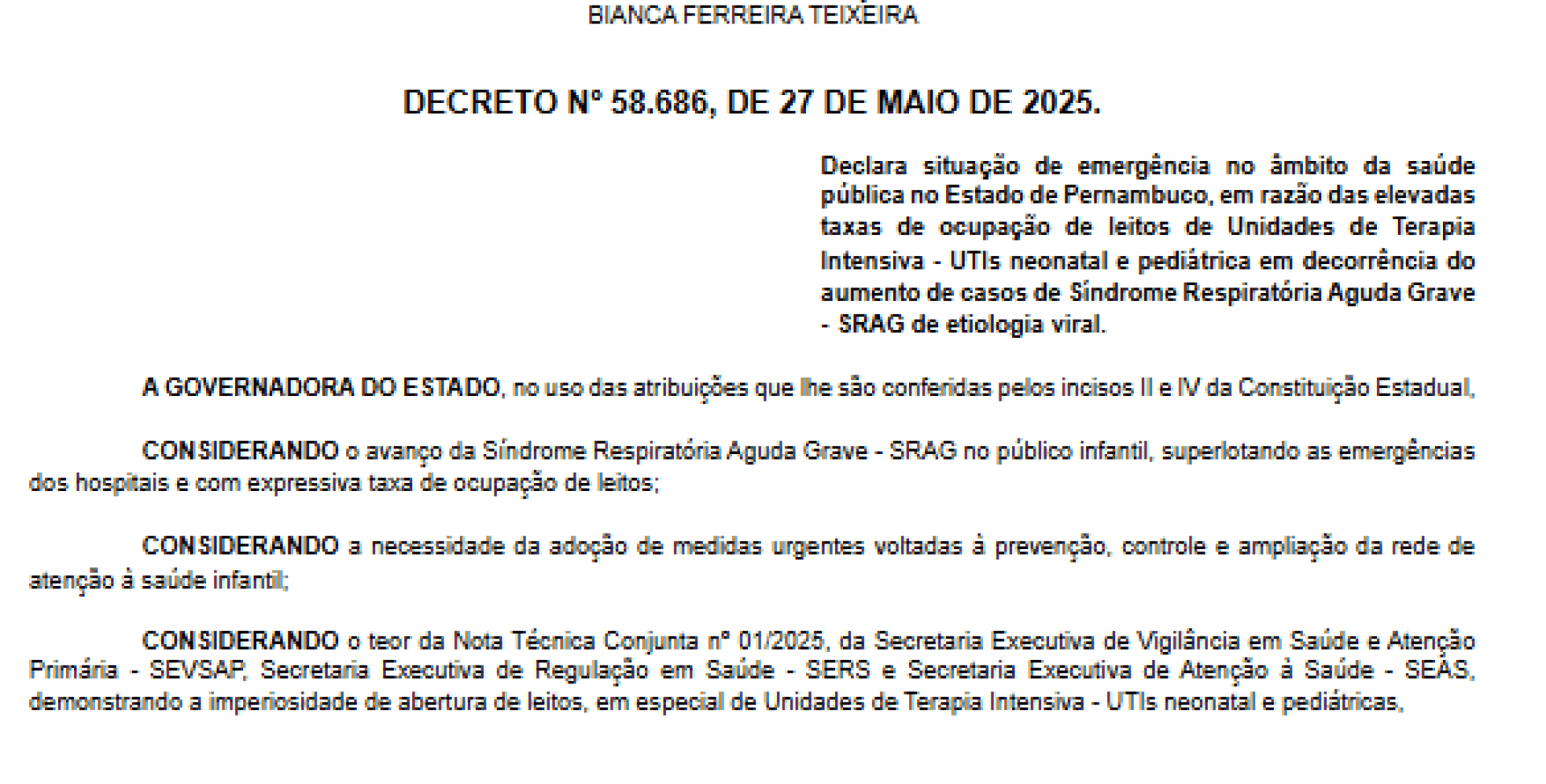 O Governo de Pernambuco decretou, nesta quarta-feira (28), situação de emergência devido as altas de ocupação em leitos de unidades de terapia intensiva (UTI) neonatal e pediátrica em decorrência do aumento de casos de síndrome respiratória aguda grave (SRAG). A informação foi divulgada na edição do Diário Oficial e tem validade de 90 dias, podendo ser prorrogada.