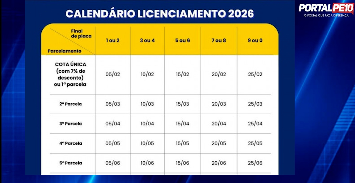 As datas variam de acordo com o final da placa do veículo. Finais 1 e 2 vencem em 5 de fevereiro; 3 e 4, no dia 10; 5 e 6, no dia 19; 7 e 8, no dia 20; e 9 e 0, no dia 25. Quem optar pelo pagamento em cota única até o vencimento de fevereiro terá desconto de 7%.