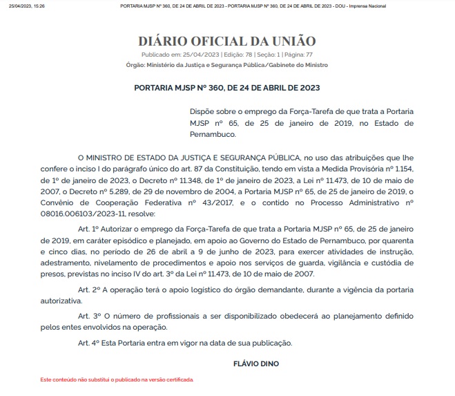 O ministro da Justiça e Segurança Pública, Flávio Dino, autorizou, hoje, o emprego da Força-Tarefa, em caráter episódico e planejado, em apoio ao Governo do Estado de Pernambuco, por quarenta e cinco dias, no período de 26 de abril a 9 de junho de 2023, nos presídios do Estado.