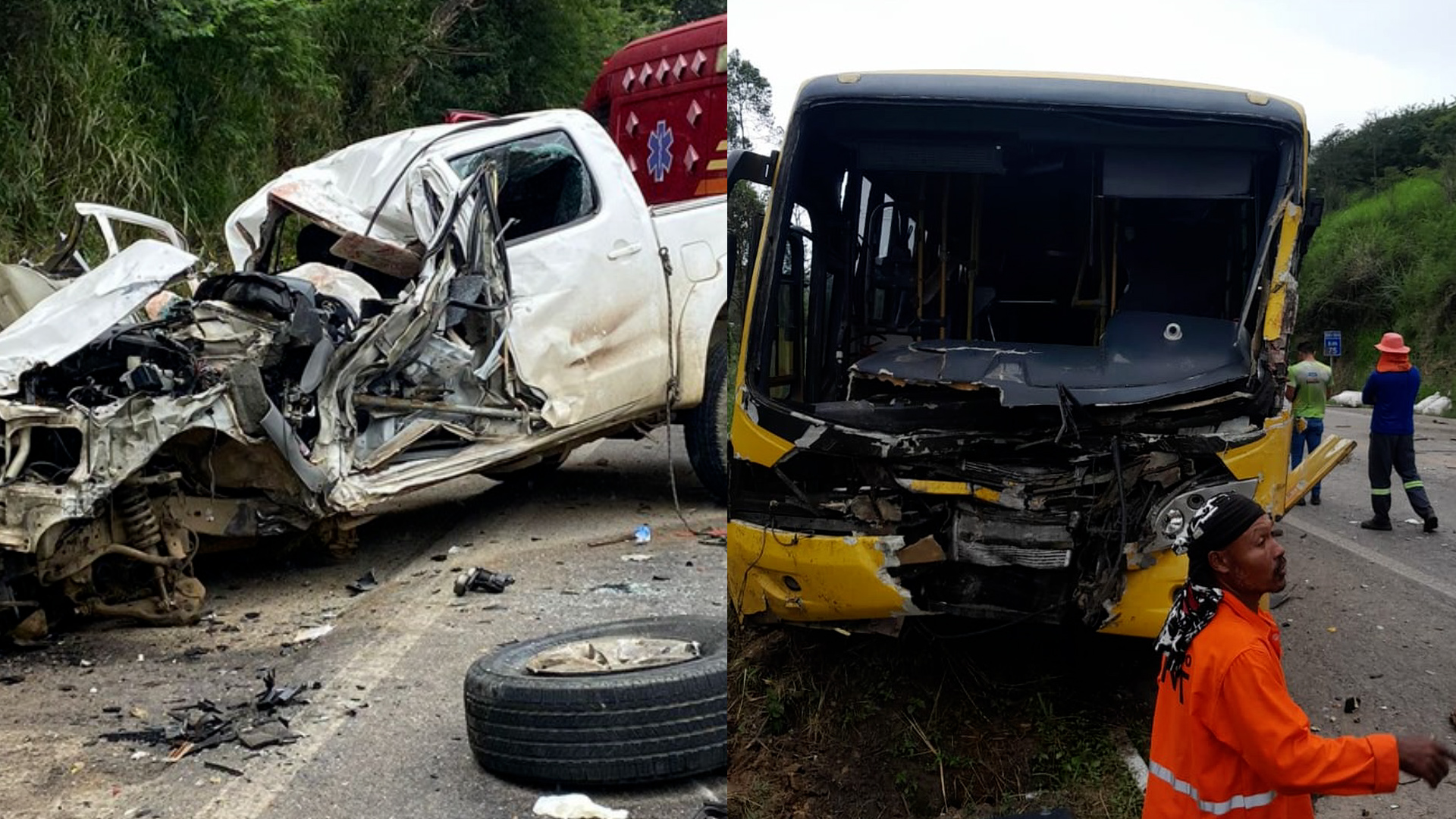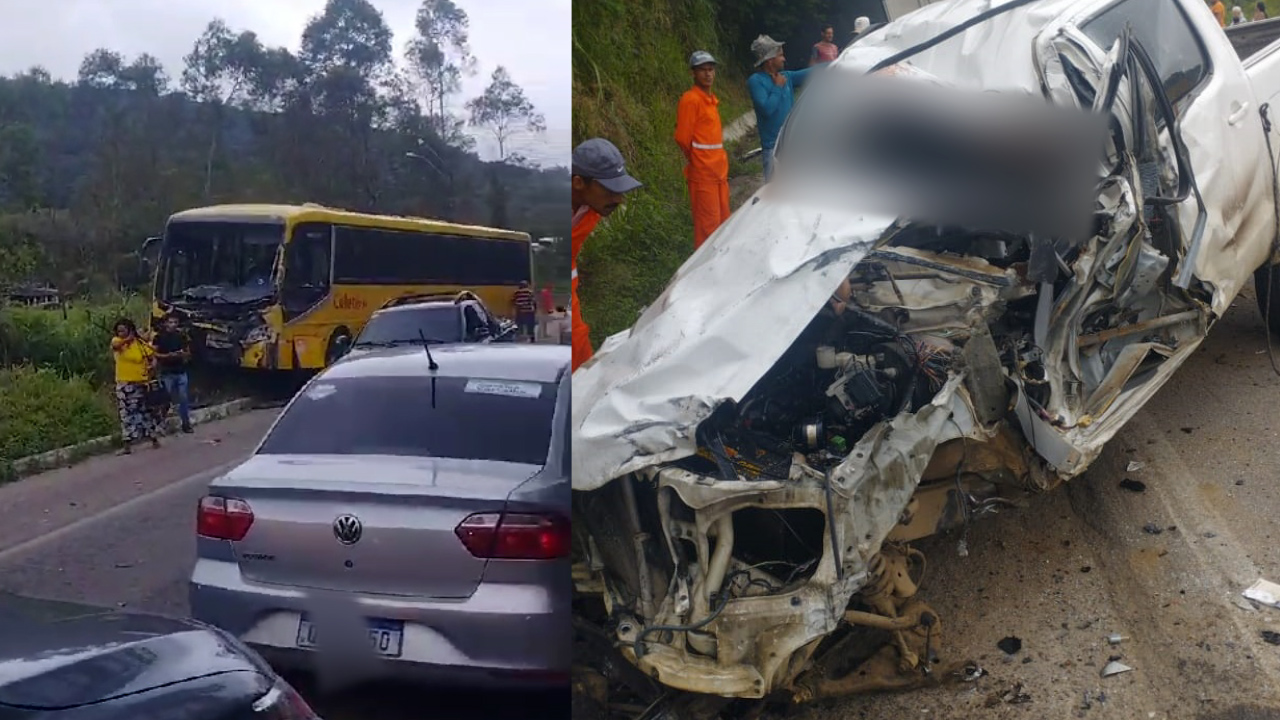 A PRF disse que um caminhão desviou de uma carro que estava na contramão da rodovia e colidiu em um barranco. Na sequência, um ônibus não conseguiu desviar e colidiu de frente com o veículo. O motorista e o passageiro da carro faleceram no local.