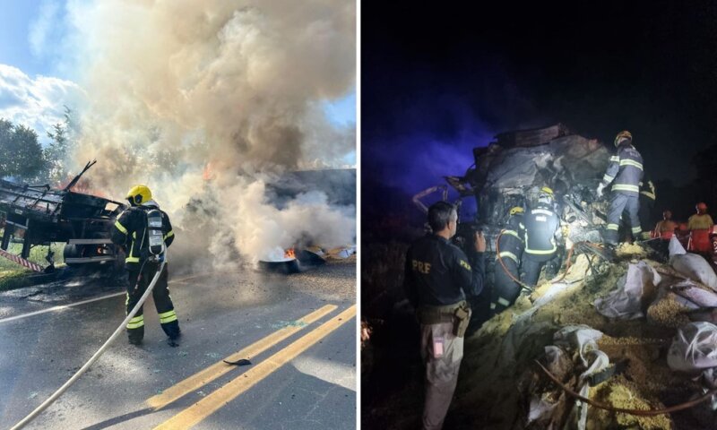 Quatro pessoas morreram carbonizadas em um acidente com caminhões no quilômetro na BR-153, no trecho de Uruaçu, no norte de Goiás, de acordo com o Corpo de Bombeiros. No total, cinco pessoas se envolveram no acidente.