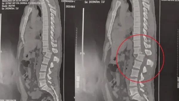 A confiança da família na recuperação se deve ao sucesso do procedimento cirúrgico, que já deu a Regilânio uma vitória: nesta terça-feira ele conseguiu sentar pela primeira vez. Duas imagens de raio-x mostram o antes e depois da cirurgia. A primeira, feita antes do procedimento, revela a coluna vertebral do paciente fraturada entre as vértebras T12 (fim da parte torácica) e L1 (início da parte lombar). Já na segunda imagem é possível verificar que a região voltou a ficar alinhada.