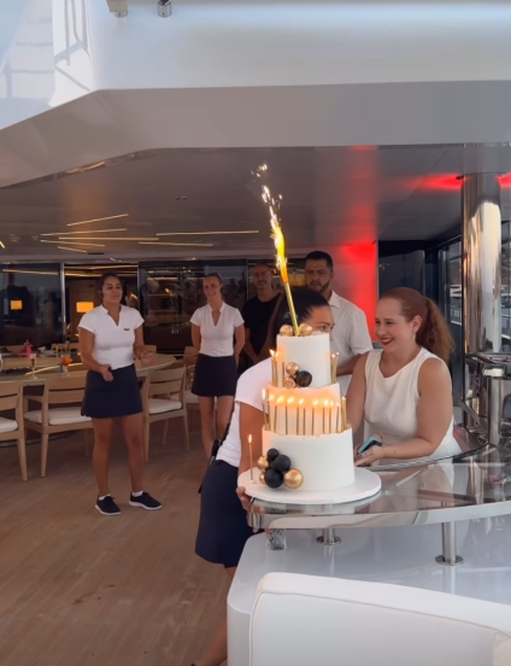 Ostentação- Feliz e radiante, Gusttavo estava em uma das mesas do iate e mostrava a garrafa de um Chateau Petrus Tinto 2009, que custa em torno de R$ 80 mil reais. A comemoração, com o próprio Gusttavo se revezando no DJ do iate, teve champanhe Cristal e Veuve Clicquot, além de arroz de carreteiro. O bolo teve três andares, com velas reluzentes.
