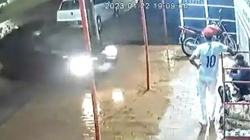 As imagens, de um circuito de segurança, mostram o momento em que a jovem chega, acompanhada de uma amiga, e joga o carro contra o homem que está sentado na calçada, próximo a uma parede. Ele acaba imprensado.