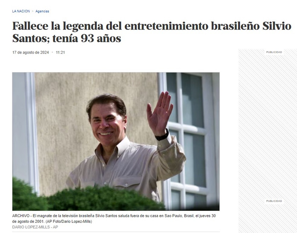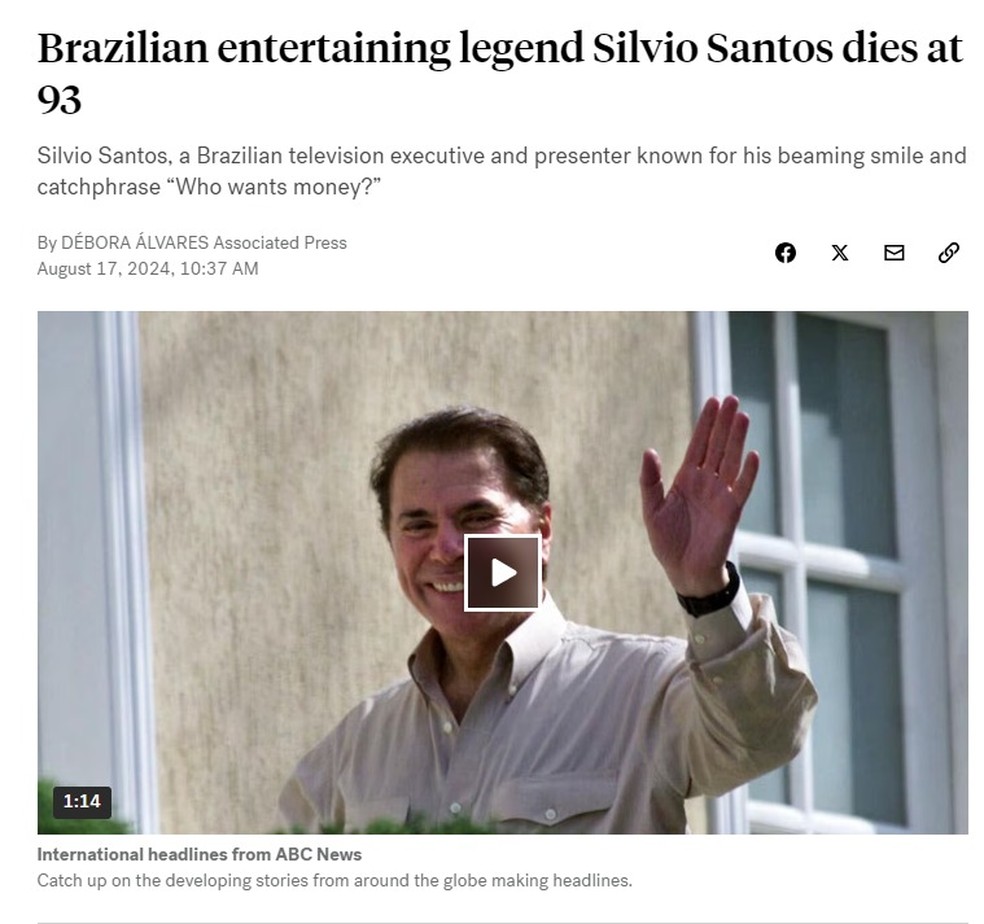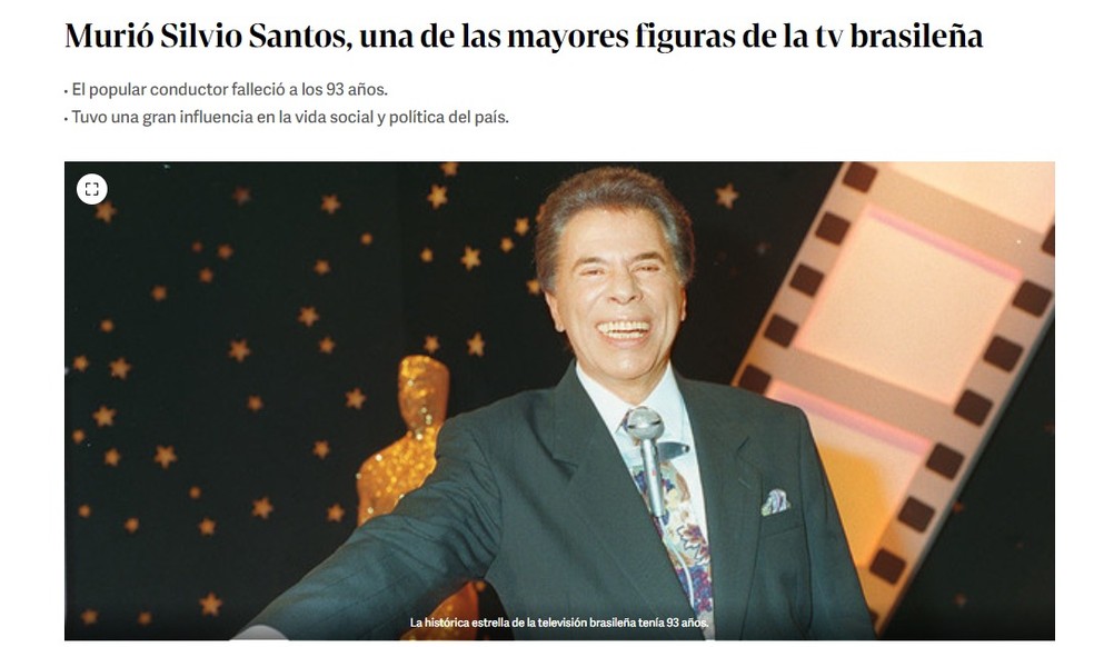 A morte do apresentador Silvio Santos está repercutindo na imprensa internacional. Jornais e portais dos Estados Unidos, Argentina e Portugal estão noticiando a despedida do maior apresentador do Brasil.