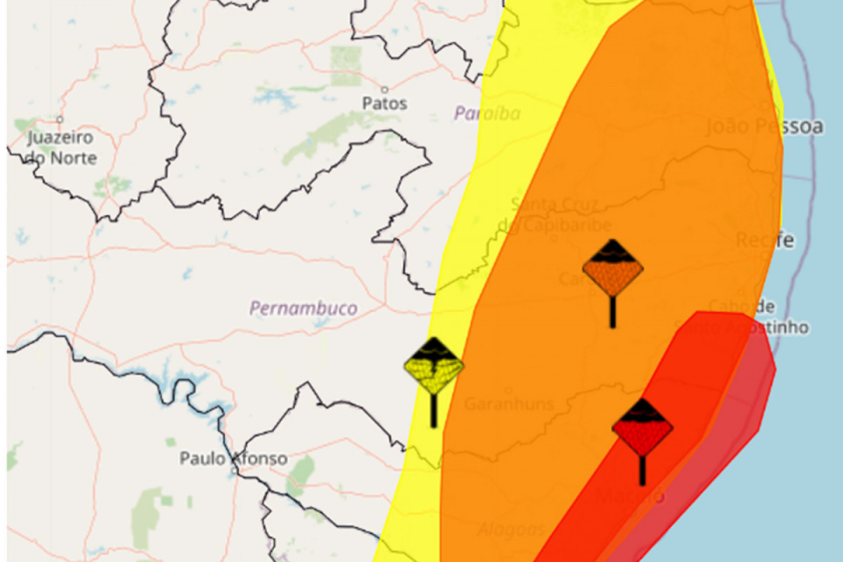 Mais 20 municípios do Agreste estão com bandeira amarela, com risco de até 50mm.