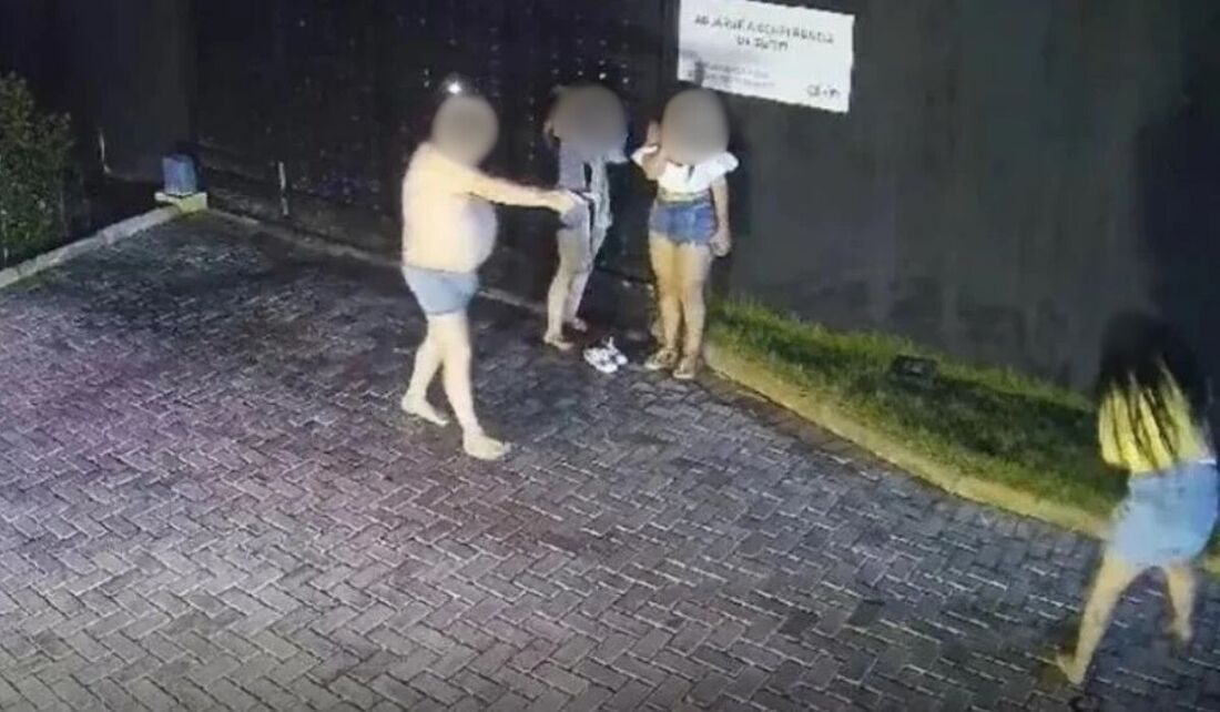 Luciano de Souza Cavalcanti puxa uma arma e dispara contra uma das mulheres, de 23 anos, que não teve o nome divulgado. Em seguida, ele guarda a arma na cintura.