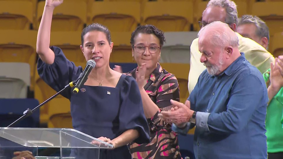 Governadora Raquel Lyra (PSDB) ao lado do presidente Lula (PT) no Recife — Foto: Reprodução/TV Globo