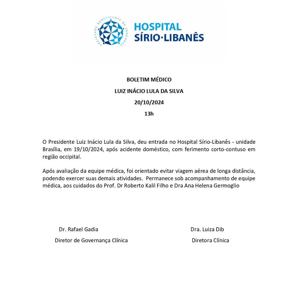 “Após avaliação da equipe médica, foi orientado evitar viagem aérea de longa distância, podendo exercer suas demais atividades. Permanece sob acompanhamento de equipe médica, aos cuidados do prof. dr. Roberto Kalil Filho e dra. Ana Helena Germoglio”, diz o boletim médico do hospital Sírio-Libanês, onde Lula está internado.