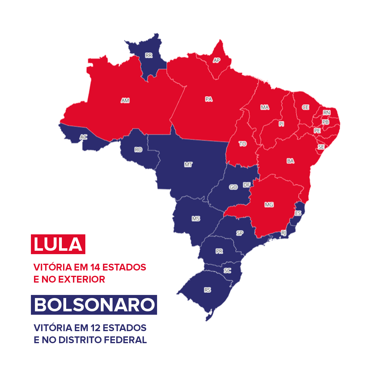 O candidato do PT venceu em 14 estados; e o do PL, em 12, além do Distrito Federal. Lula ficou com a maioria dos votos em todos os estados do Nordeste, enquanto Bolsonaro teve maior adesão em todos os estados do Sul e Centro-Oeste.