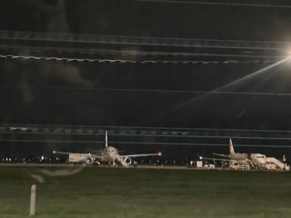 À esquerda, a aeronave principal da Presidência que apresentou problema técnico; à direita, o avião no qual a comitiva está voltando para o Brasil — Foto: Raquel Krahenbuhl/TV Globo