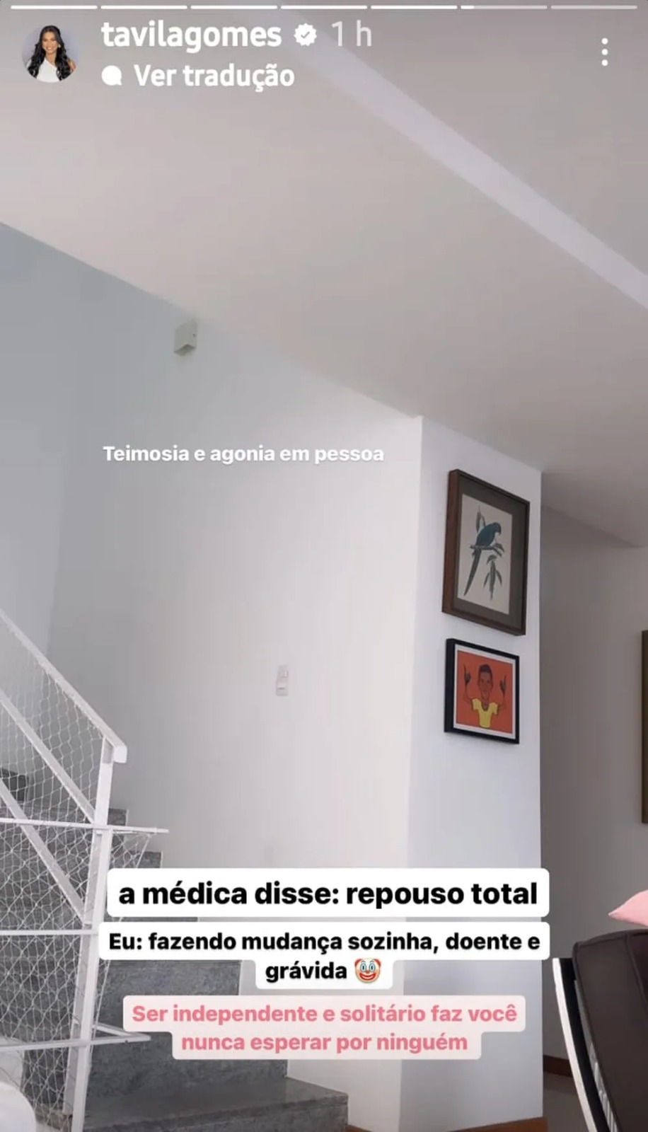 “A médica disse: repouso total. Eu: fazendo mudança, sozinha e grávida. Ser independente e solitário faz você nunca esperar por ninguém”, disse ela, que estava hospitalizada no dia anterior.