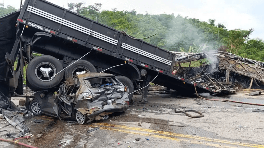 Por volta das 3h30 três veículos se envolveram no acidente: um ônibus da empresa Emtram, um carro de passeio, e uma carreta carregada com bloco de granito.