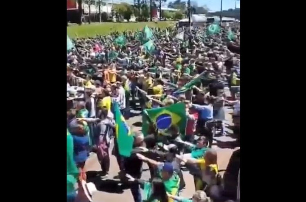 Na manhã desta terça-feira (02), os manifestantes fizeram um gesto semelhante à saudação nazista “sieg heil”, com a mão estendida, enquanto cantavam o Hino Nacional do Brasil. O gesto foi usado na Alemanha de Hitler e na Itália de Mussolini, durante os governos nazifascistas.