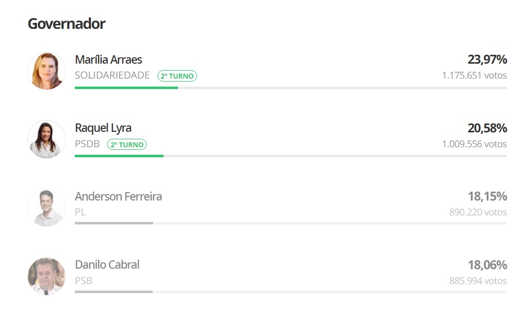 Em uma eleição excepcional, o eleitorado não escolheu apenas uma, mas duas mulheres para disputar o governo no segundo turno. Com mais de 1 milhão de votos cada uma, Marília Arraes (Solidariedade) e Raquel Lyra (PSDB) deixaram os candidatos homens para trás. Marília teve 23,97% dos votos e Raquel 20,58%.