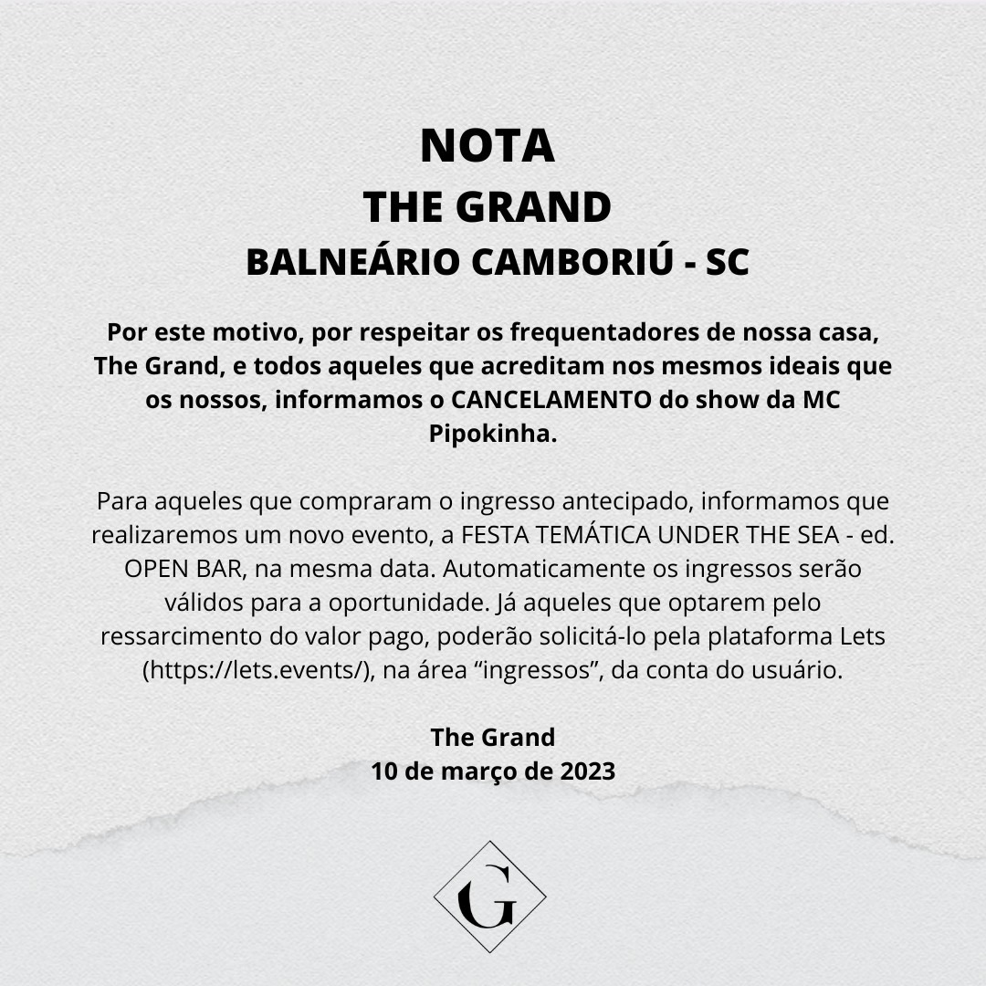 O show que MC Pipokinha iria realizar em Balneário Camboriú – Santa Catarina, foi cancelado pela The Grand, casa que receberia a artista. O comunicado foi emitido nesta sexta-feira (10).