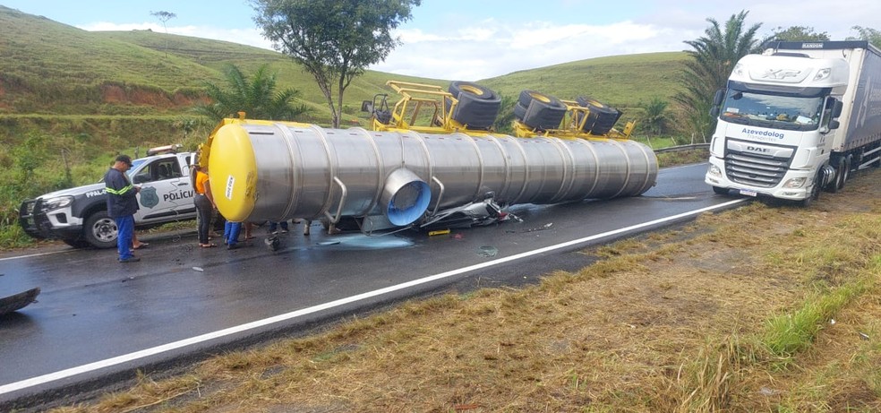 O motorista do caminhão não se feriu. Ele relatou à Polícia Rodoviária Federal (PRF) que perdeu o controle da direção depois que o pneu do tanque desceu no acostamento, que fica em um nível mais baixo, e tombou quando tentou voltar à pista.