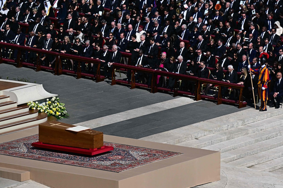O Livro dos Evangelhos repousa sobre o caixão do papa Francisco durante a cerimônia fúnebre na Praça de São Pedro, no Vaticano. Foto Tiziana FabiAFP