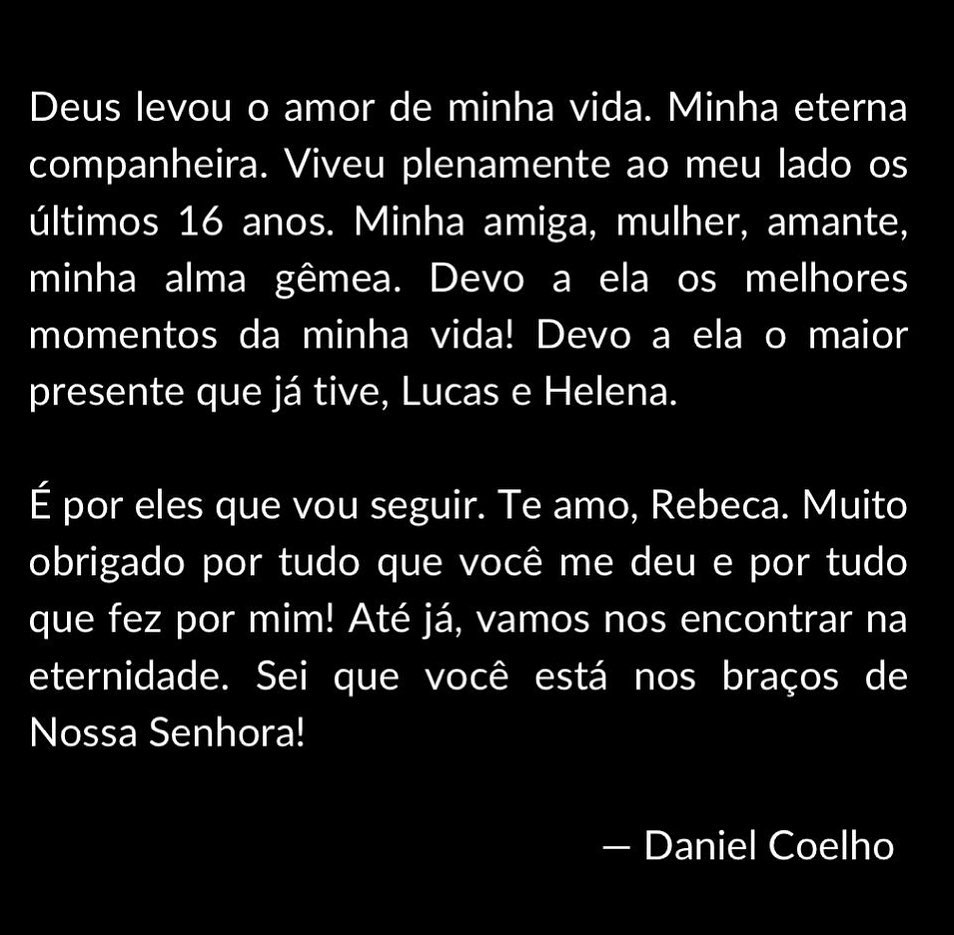 “É por eles que vou seguir. Te amo, Rebeca. Muito obrigado por tudo que você me deu e por tudo que fez por mim”. Até já, vamos nos encontrar na eternidade. Sei que você está nos braços de Nossa Senhora!”, completou.