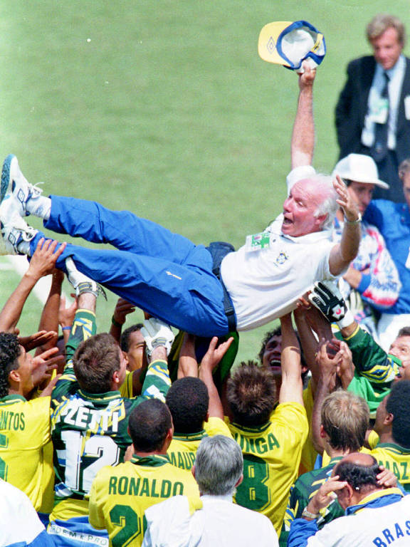 Zagalo é atirado para o alto pelos jogadores após vencer a Copa do Mundo de 1994, nos EUA – Antônio Gaudério – 17.jul.1994/Folhapress