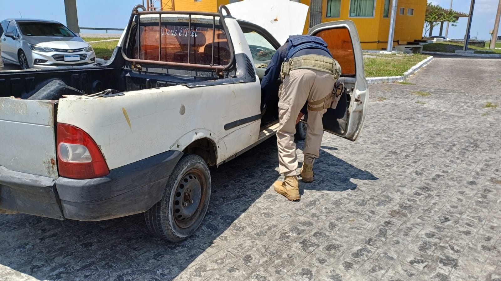 Durante uma operação de segurança viária, a caminhonete Strada chamou a atenção dos policiais pois o condutor realizou uma manobra de retorno ao visualizar a fiscalização. A equipe realizou a abordagem e verificou que o condutor não possuía a carteira de habilitação. No decorrer da vistoria, os agentes constataram sinais de adulteração presentes no motor do automóvel, que estava com restrição de furto no estado de São Paulo.